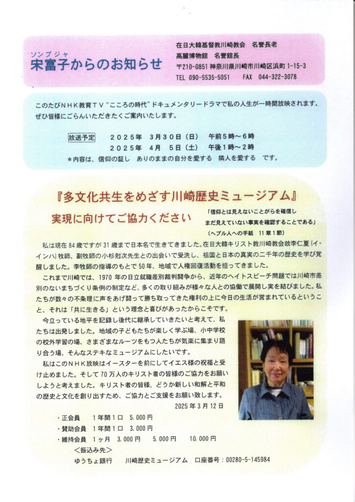 宋富子代表NHKに出演 2025年3月23日 最終更新日時 : 2025年12月16日 tabunkakawasaki 宋富子代表そんぷじゃだいひょうが、NHK Eテレ”こころの時代じだい”に出演しゅつえんします。皆みなさん是非ぜひご覧らんください。 放送予定日ほうそうよていび 3月がつ30日にち(日にち) 午前ごぜん5時じ~6時じ 4月じ 5日か(土ど) 午後ごご1時じ~2時じ
