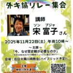 本会ほんかい宋富子代表そんぷじゃだいひょうが11がつ22にち午前ごぜん10から多文化共生たぶんかきょうせいをめざす川崎歴史かわさきれきしミュージアム設立せつりつけて「いま、なぜ歴史観れきしかん必要ひつようなのか」とだいして講演こうえんおこないます。みなさんるってご参加さんかください。